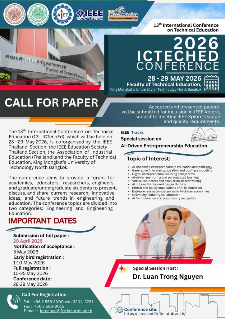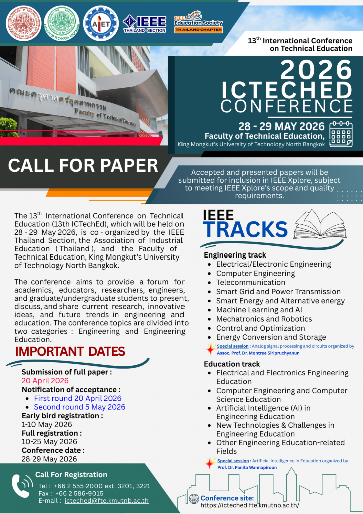 We are pleased to announce that the call for paper for the 13th International Conference on Technical Education (13th ICtechEd) which will be held on 28 – 29 May 2026. The conference is co-organized by IEEE Thailand Section, the Association of Industrial Education (Thailand) and the Faculty of Technical Education King Mongkut’s University of Technology North Bangkok. The conference aims to provide a forum for academics, educators, researchers, engineers, and graduated/undergraduate students to present, discuss, and share current research, innovative ideas, and future trends in engineering and education. The conference topic is separated into two categories: Engineering and Engineering Education.