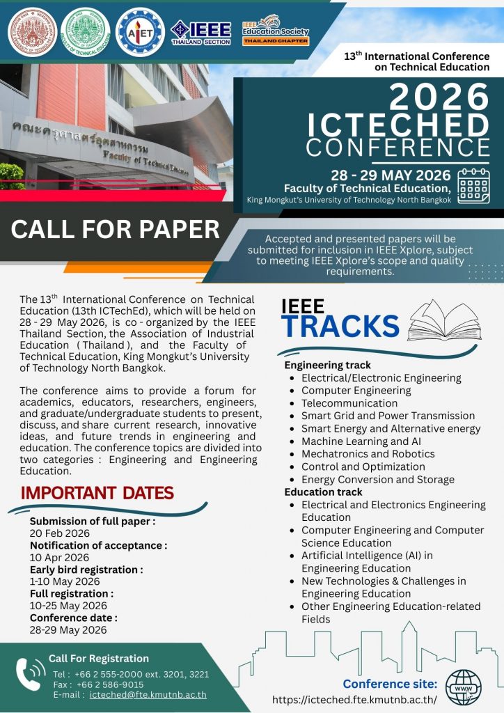 We are pleased to announce that the call for paper for the 13th International Conference on Technical Education (13th ICtechEd) which will be held on 28 – 29 May 2026. The conference is co-organized by IEEE Thailand Section, the Association of Industrial Education (Thailand) and the Faculty of Technical Education King Mongkut’s University of Technology North Bangkok. The conference aims to provide a forum for academics, educators, researchers, engineers, and graduated/undergraduate students to present, discuss, and share current research, innovative ideas, and future trends in engineering and education. The conference topic is separated into two categories: Engineering and Engineering Education.